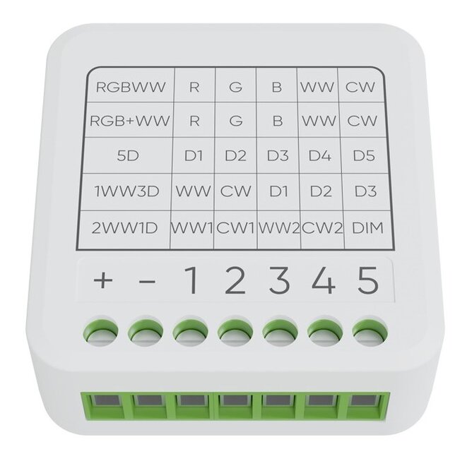 Thiết bị hỗ trợ 5 tính năng: RGBWW, RGB & WW, 5 Dim, 1 Dim 2 WW, 3 Dim 1 WW